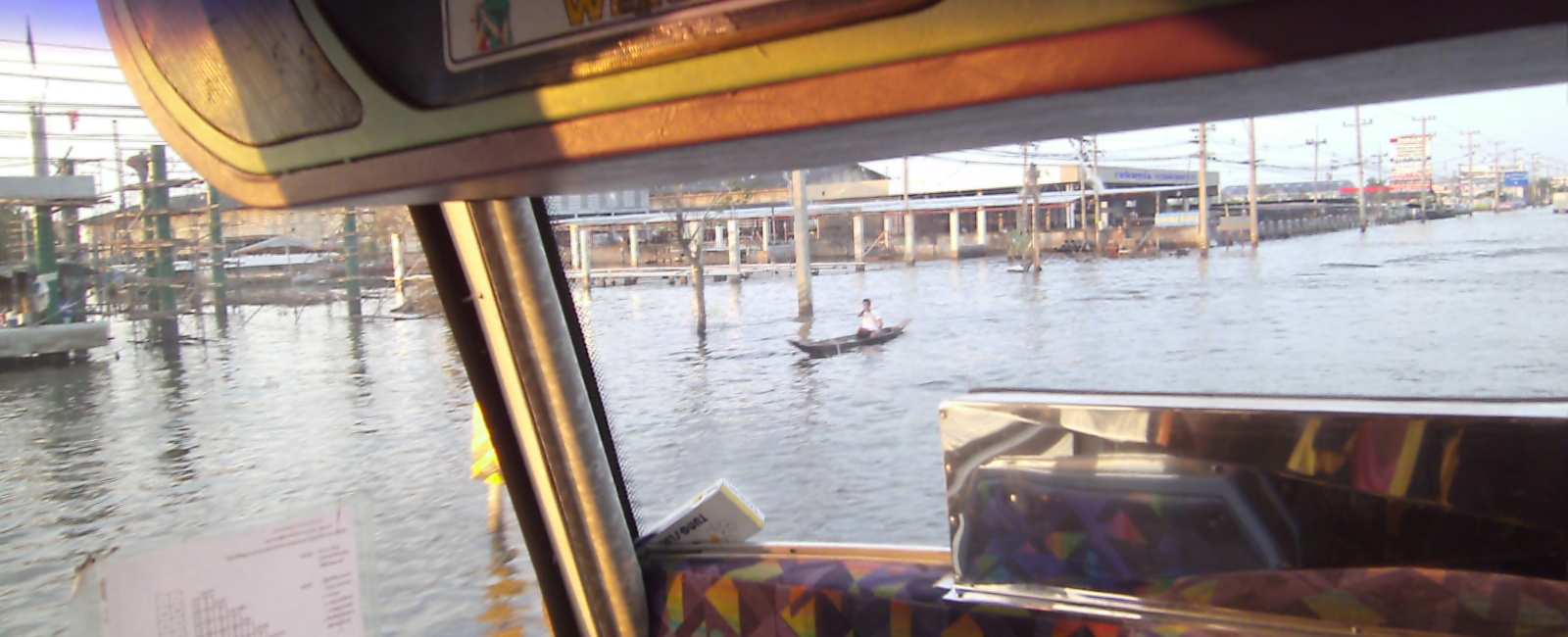 | A man floats by our bus on the other side of the very submerged road. |