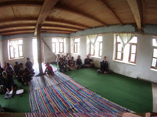 Our breath hung in the air above the empty trail as the whitewashed building closed in. Urkin pulled back a small, metal gate and used two hands to place a sizeable rock at the corner to hold it in place. We squeezed through and approached the double doors of the church. Boots lined the front stairs, and I looked up at the clouds threatening rain while I removed my boots as well. A loud voice thundered from inside the church. Timidly we approached the door and stood motionless viewing the single room with colorful woven rugs lining the floor. The voice stopped, every head turned and all eyes were on us. Looking at us from their eyes, I am sure that we looked quite peculiar in our strange black costume. We quickly sat down on the floor directly in front of the door to get the attention off of us, but to our chagrin it only brought more attention.