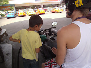 | Fueling up for our trip. An 8 year old boy pumps our gas for us. I guess you're never too young to start working in Thailand. |