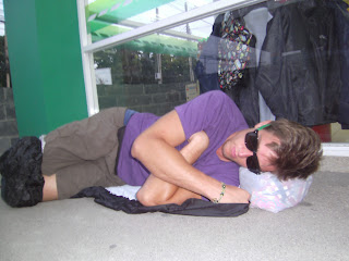 using our gi-normous backpacks as pillows, concealed behind a crude wall of